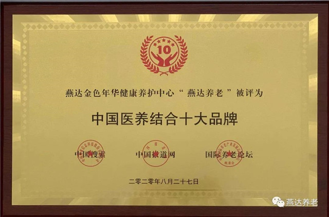 2020年8月27日,燕達金色年華健康養護中心分別于《第五屆中國養老行業陸家嘴峰會》、《中國國際養老產業博覽會中國養老十大品牌評選》兩項活動中捷報頻傳,喜獲“中國五大養老服務品牌”及“中國醫養結合十大品牌”兩項殊榮。