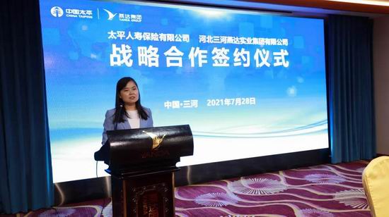 7月28日下午,太平人壽保險有限公司與河北三河燕達(dá)實業(yè)集團(tuán)有限公司在燕達(dá)國際健康城隆重舉行戰(zhàn)略合作簽約儀式。雙方將攜手在醫(yī)療健康產(chǎn)業(yè)、聯(lián)合營銷、長期養(yǎng)老服務(wù)、保險服務(wù)等方面進(jìn)行深度合作,打造出“保險金融+康養(yǎng)服務(wù)”的融合創(chuàng)新合作模式。燕達(dá)金色年華健康養(yǎng)護(hù)中心副總經(jīng)理李東輝擔(dān)任活動主持。