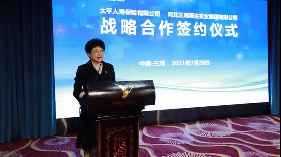 三河市燕郊高新區(qū)黨工委書記、管委會主任崔浩泉在致辭中表示:兩大集團(tuán)的攜手,是優(yōu)勢互補(bǔ)、強(qiáng)強(qiáng)聯(lián)合,將推動燕郊經(jīng)濟(jì)高質(zhì)量發(fā)展,將壯大燕郊醫(yī)療健康產(chǎn)業(yè)規(guī)模、延伸產(chǎn)業(yè)鏈條,將促進(jìn)燕郊健康產(chǎn)業(yè)與保險產(chǎn)業(yè)的良性互動,提升燕郊醫(yī)療健康產(chǎn)業(yè)整體水平。希望雙方精誠聯(lián)合、精準(zhǔn)對接,開展多層次、多領(lǐng)域的深度合作,共創(chuàng)更加輝煌的明天。