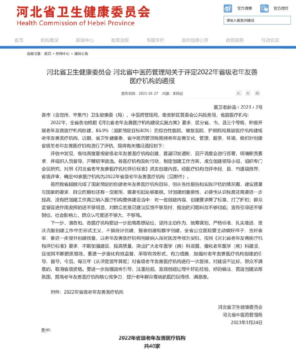 3月27日,河北省衛健委官網發布了河北省衛生健康委員會、河北省中醫藥管理局《關于評定2022年省級老年友善醫療機構的通報》冀衛老齡函〔2023〕2號,確定40家醫療機構為2022年省級老年友善醫療機構,其中廊坊市2家,河北燕達醫院榜上有名,成為省級老年友善醫療機構。